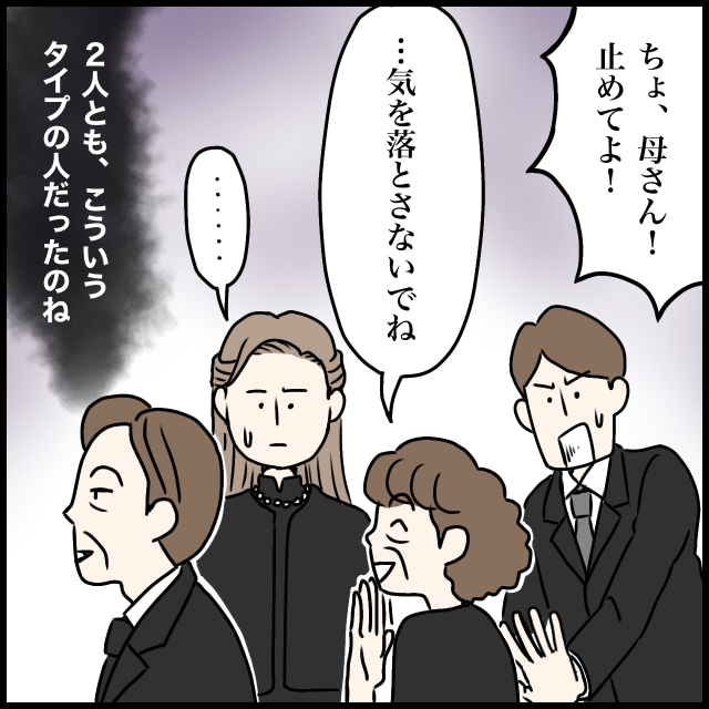 葬儀で失礼な発言をする義両親を前に何も言えずにいると、ナオヤが慌てて「ちょ、母さん!止めてよ!」と言いに来てくれました。すると、取って付けたように義母が「気を落とさないでね。」とひと言。2人とも、こういうタイプの人だったのねと、私は初めて義理の両親の真の姿を見た気がしました。