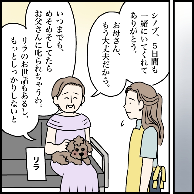 葬儀が終わっても、母が心配な私はしばらく実家に滞在していました。母は「シノブ、5日間も一緒にいてくれてありがとう。お母さん、もう大丈夫だから。」と逆に私を気遣って言いました。「いつまでも、めそめそしてたらお父さんに叱られちゃうわ。リラのお世話もあるし、もっとしっかりしないと」と愛犬リラを抱いた母は笑顔を作りました。