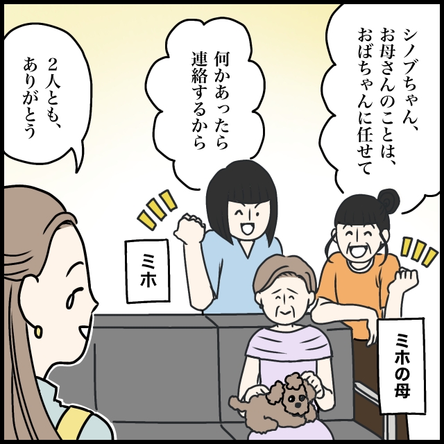幼馴染のミホも、しょっちゅう母の顔を見に来てくれました。この日もミホのお母さんと一緒に来てくれていて、「シノブちゃん、お義母さんのことはおばちゃんに任せて」とミホのお母さんが言うと、ミホも「何かあったら連絡するから」と頼もしく、ありがたいことばをかけてくれて、私は嬉しくて泣いてしまいました。
