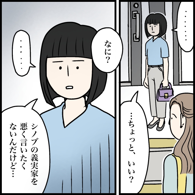 玄関まで見送ったミホが、少し困惑したような、悩んだような顔で沈黙を置いた後、「ちょっといい?」と思い切ったように言いました。そして「シノブの義実家を悪く言いたくないんだけど」と、ミホにしては珍しく言いにくそうに切り出したので、葬儀の時の失礼な態度の義両親を思い出しつつ、私はなにごとかと身構えました。