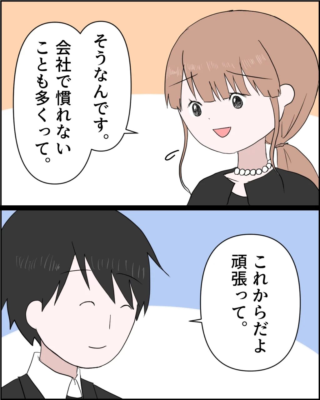 「そうなんです。会社で慣れないことも多くって」と不安そうにうつむきながら話すあかりちゃんに「これからだよ。頑張って」と優しい笑顔を浮かべながら謙介が言うと、