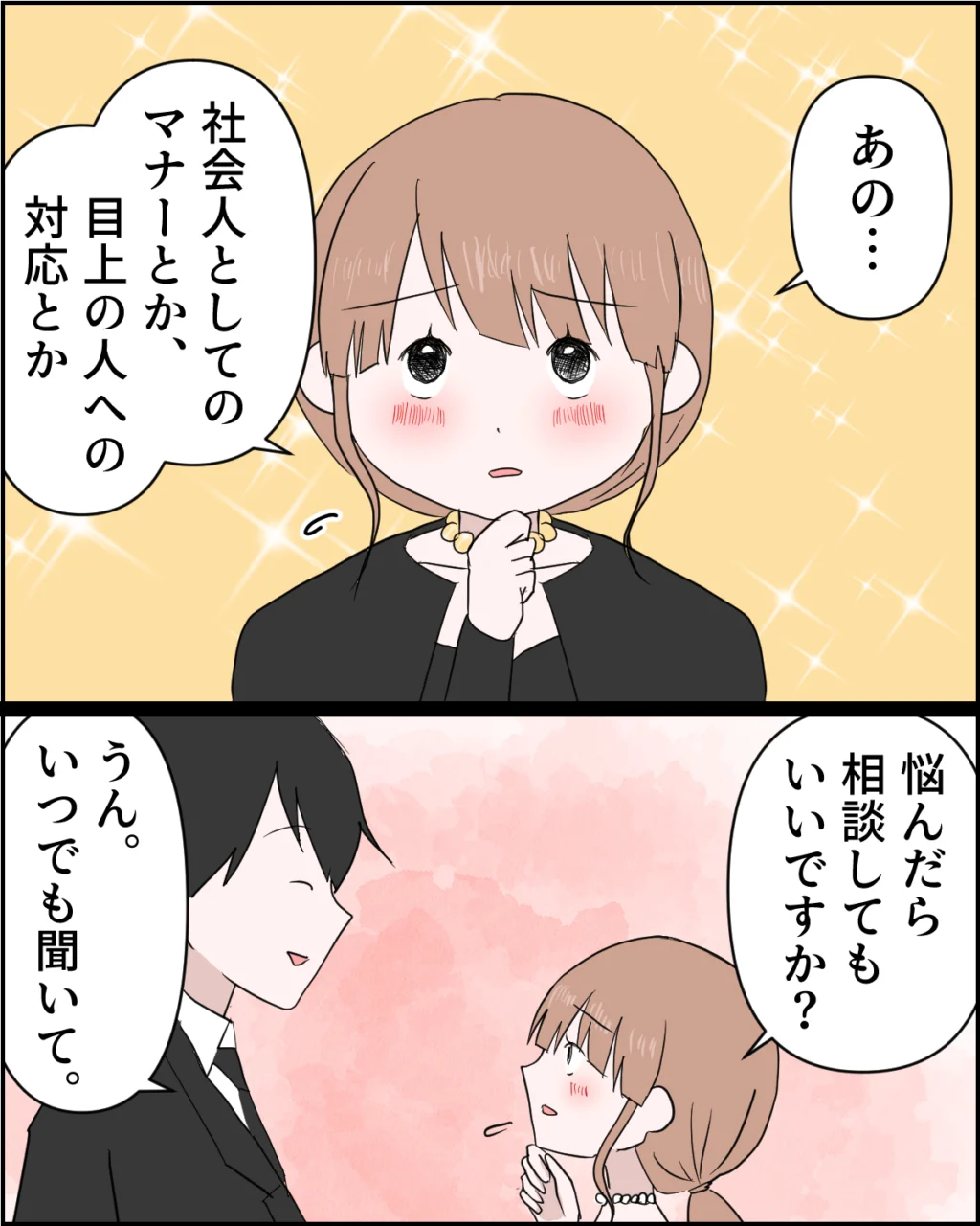 「あの・・社会人としてのマナーとか、目上の人への対応とか・・悩んだら相談してもいいですか?」あかりちゃんにそう言われ、「うん。いつでも聞いて」謙介がそう答えると、