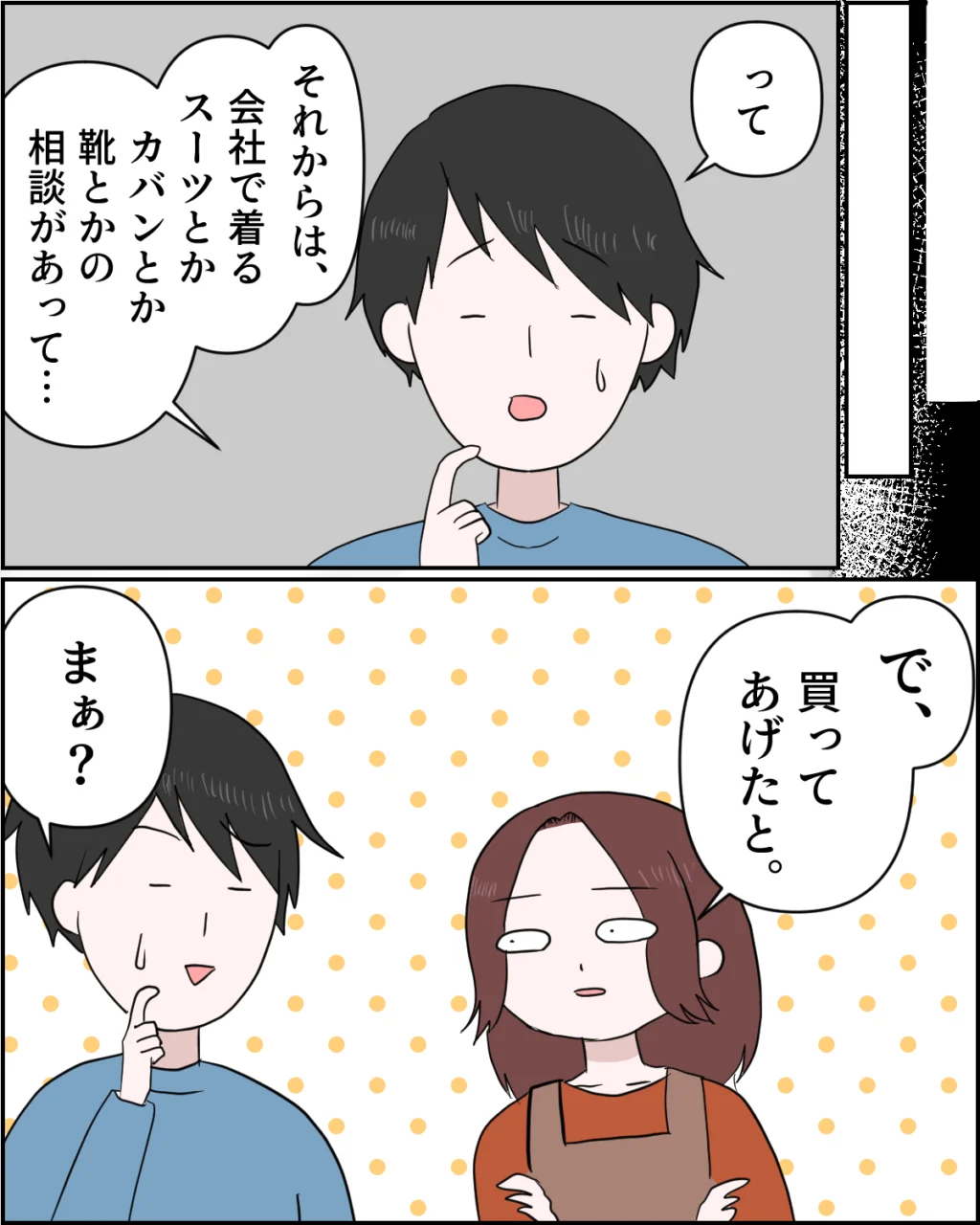 「って。それからは、会社で着るスーツとか、カバンとか靴とかの相談があって・・」あかりちゃんとの経緯を話す謙介の言葉を聞いて、「で、買ってあげたと」と、どうせ買ったんでしょと言わんばかりの含みを持たせて私がそう聞くと、「まぁ?」と返事。健介は案の定、あかりちゃんにプレゼントしたことを認めたのでした。