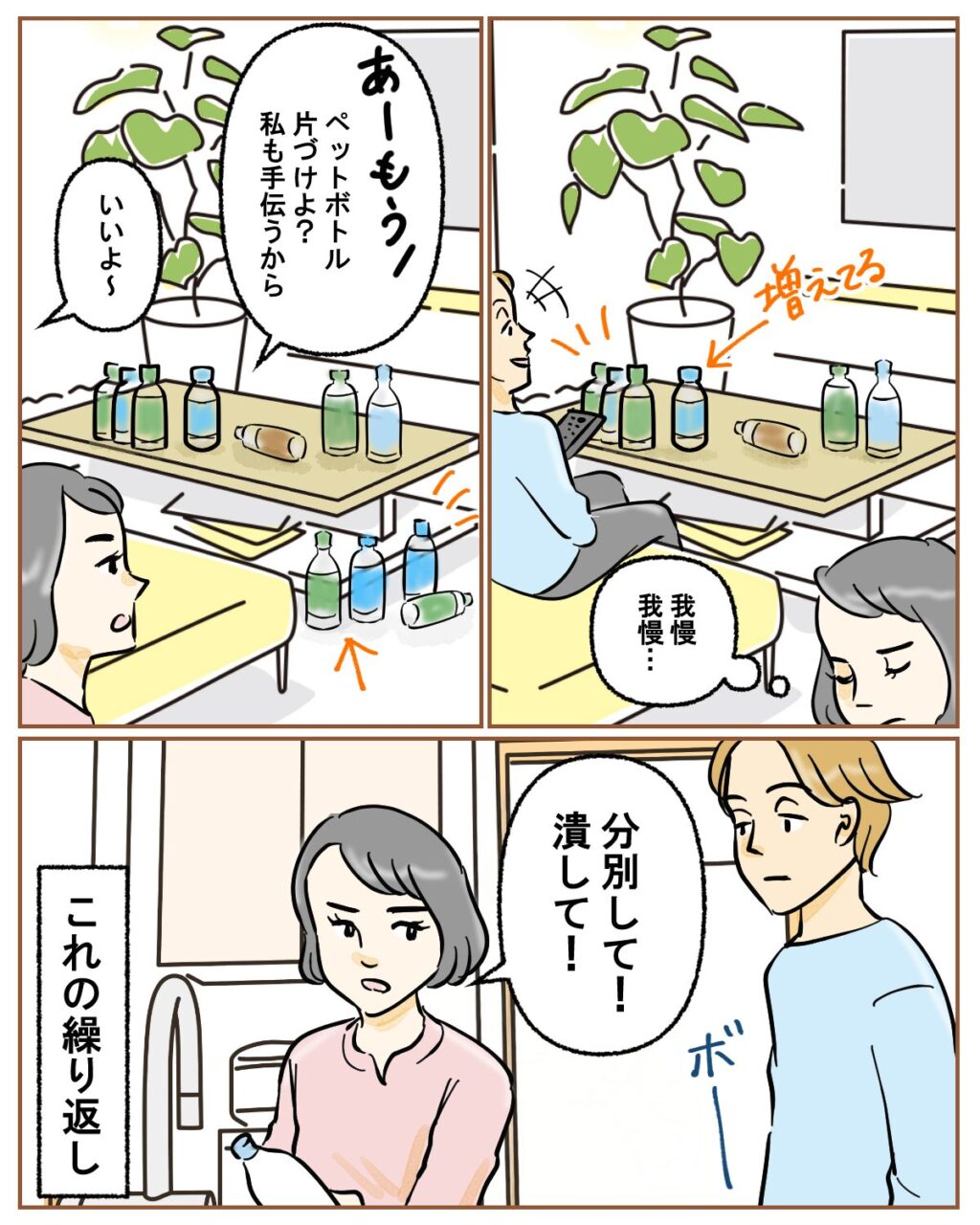 夫のツカサさんは何をしてもほったらかし。ペットボトルも全く片づけず、テーブルに山積み。妻ナズナさんが片付けてと言っても言うことを聞く様子もなし。呆れて「片づけよ。私も手伝うから」と言うも、指示待ちで立ってるだけ。結局ナズナさんがペットボトルをすすぎ「分別して!」「潰して!」と全て指示することに。こんな毎日、本当うんざりしてしまいますよね。
