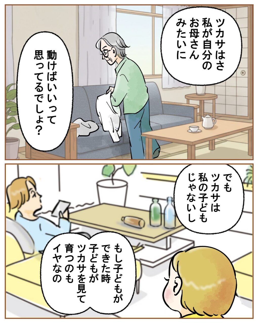 「ツカサはさ、私が自分のお母さんみたいに動けばいいって思ってるでしょ?でもツカサは私の子どもじゃないし、もし子どもができた時、子どもがツカサを見て育つのもイヤなの」と言い、さらに