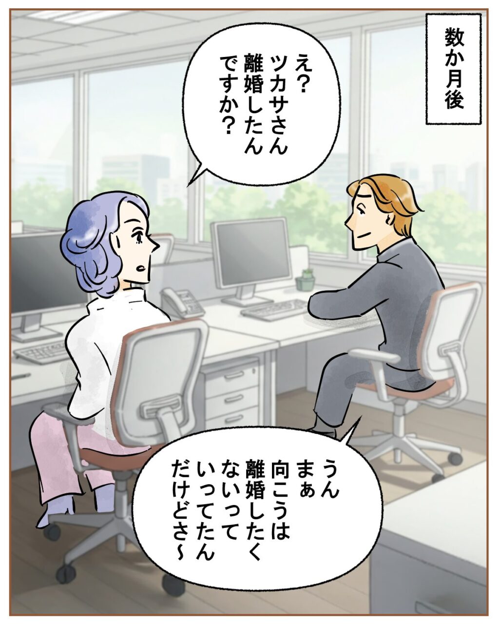 「え?ツカサさん離婚したんですか?」会社で女性社員にそう聞かれ、「うん、まぁ。向こうは離婚したくないって言ってたんだけどさ~」とツカサさんが答えると、