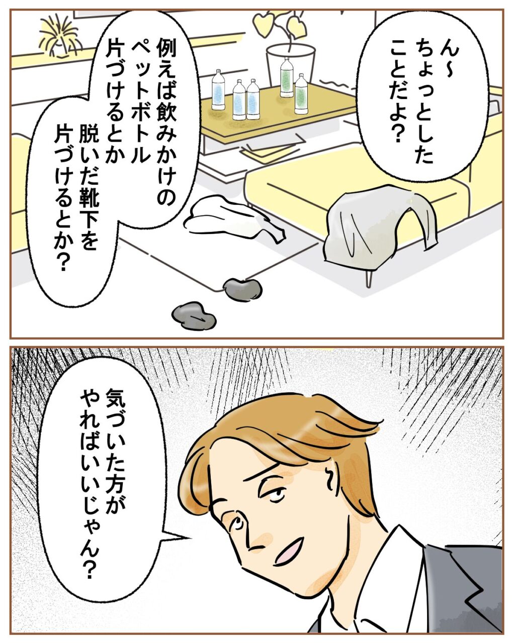 「ん~、ちょっとしたことだよ?例えば飲みかけのペットボトル片づけるとか、脱いだ靴下を片づけるとか?気づいた方がやればいいじゃん?」