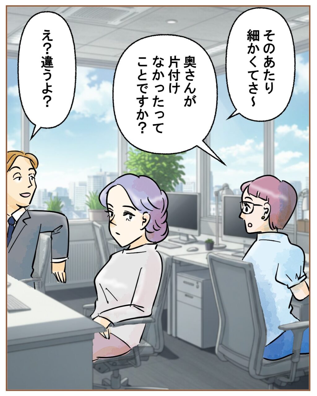 「そのあたり細かくてさ~」ツカサさんがそう言うと、「奥さんが片付けなかったってことですか?」ともう一人の社員がたずね、「え?違うよ?」とツカサさんが答えました。
