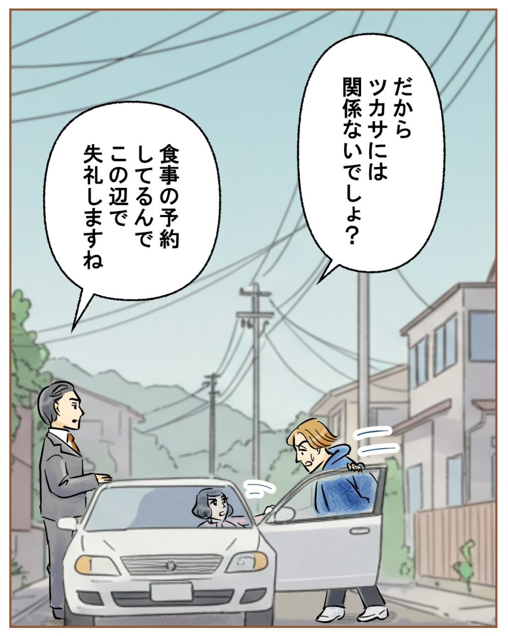 突然ナズナさんの実家にやって来たツカサさんに、何かあったのかとたずねるナズナさん。すると車から降りて来たキサラギさんに「え?誰その男?」と失礼な物言いのツカサさん。ナズナさんがたしなめると「初めまして」とキサラギさんがツカサさんににじり寄って挨拶を。その後、ナズナさんを車に乗せるキサラギさんを見て、「なんだよ?誰だよ?」と詰め寄るツカサさんに、「関係ないでしょ?」とナズナさんが静かに言いました。