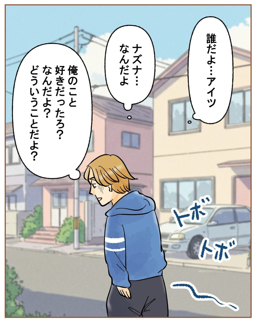走り去って行った車が見えなくなり、「誰だよ・・アイツ」と文句を言うツカサさんは、「ナズナ・・なんだよ。俺のこと好きだったろ?なんだよ?どういうことだよ?」トボトボ歩きながら不満タラタラ。
