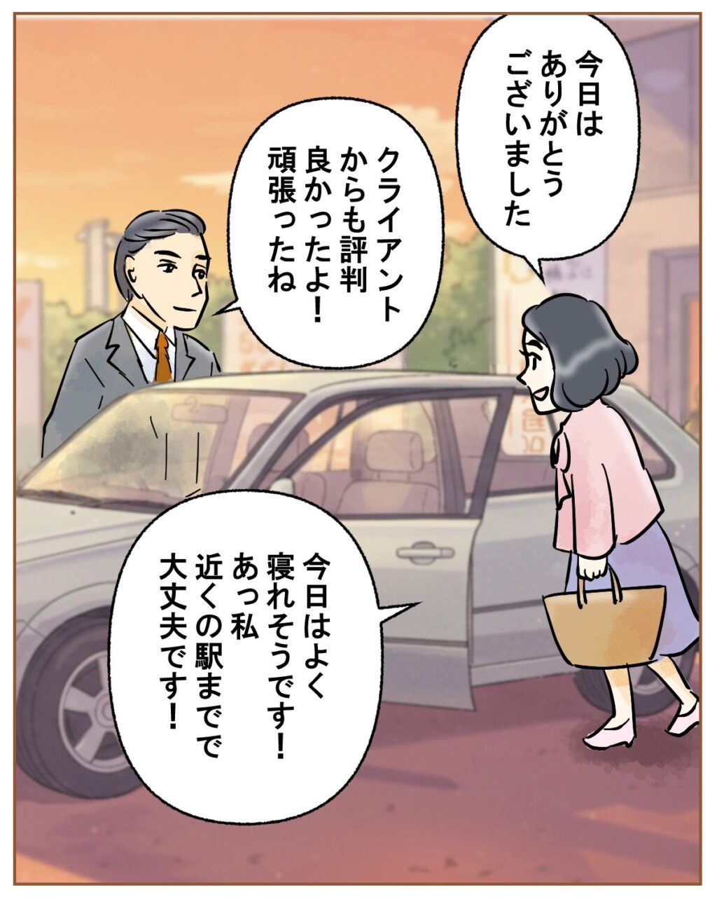「今日はありがとうございました」ナズナさんがお礼を言うと、「クライアントからも評判良かったよ!頑張ったね」キサラギさんが褒めてくれ、「今日はよく眠れそうです!あっ、私近くの駅までで大丈夫です!」とナズナさんが伝えると、