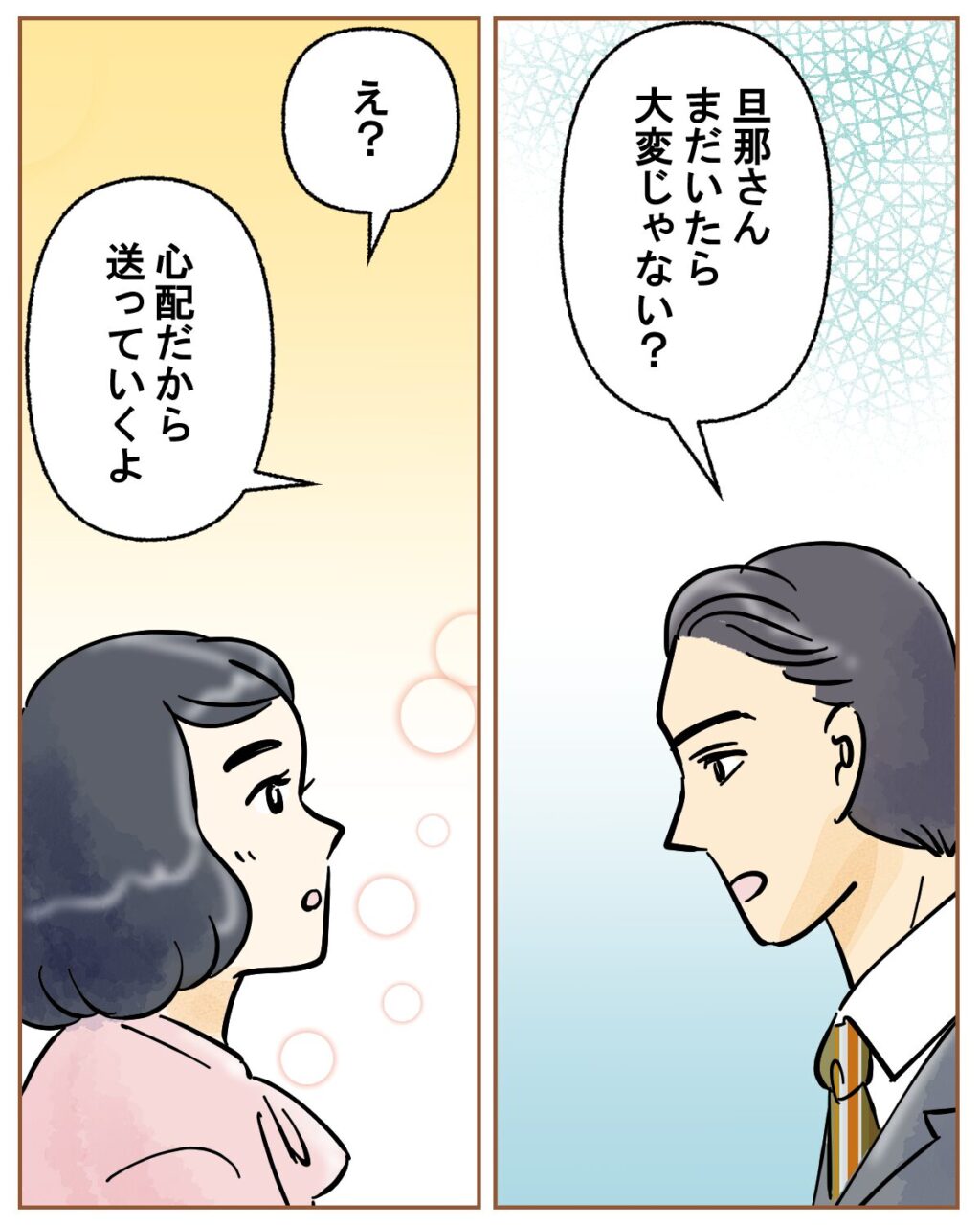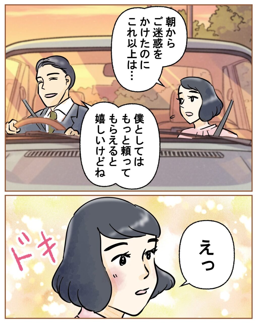 「旦那さん、まだいたら大変じゃない?」キサラギさんにそう言われ、「え?」と言うと、「心配だから送っていくよ」と申し出てくれました。キサラギさんの言葉にちょっぴりドキドキするナズナさん。