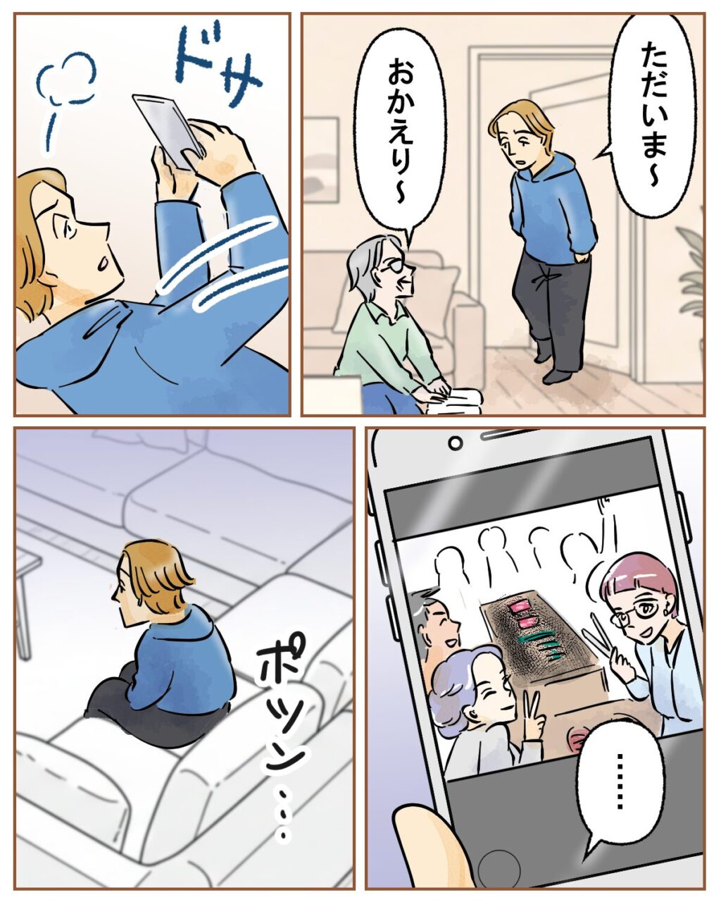 部屋に行ったツカサさんがスマホを取り出すと、会社のみんなが楽しそうに焼肉を食べているのを見て、ポツンと独り、ソファに座りこむのでした。