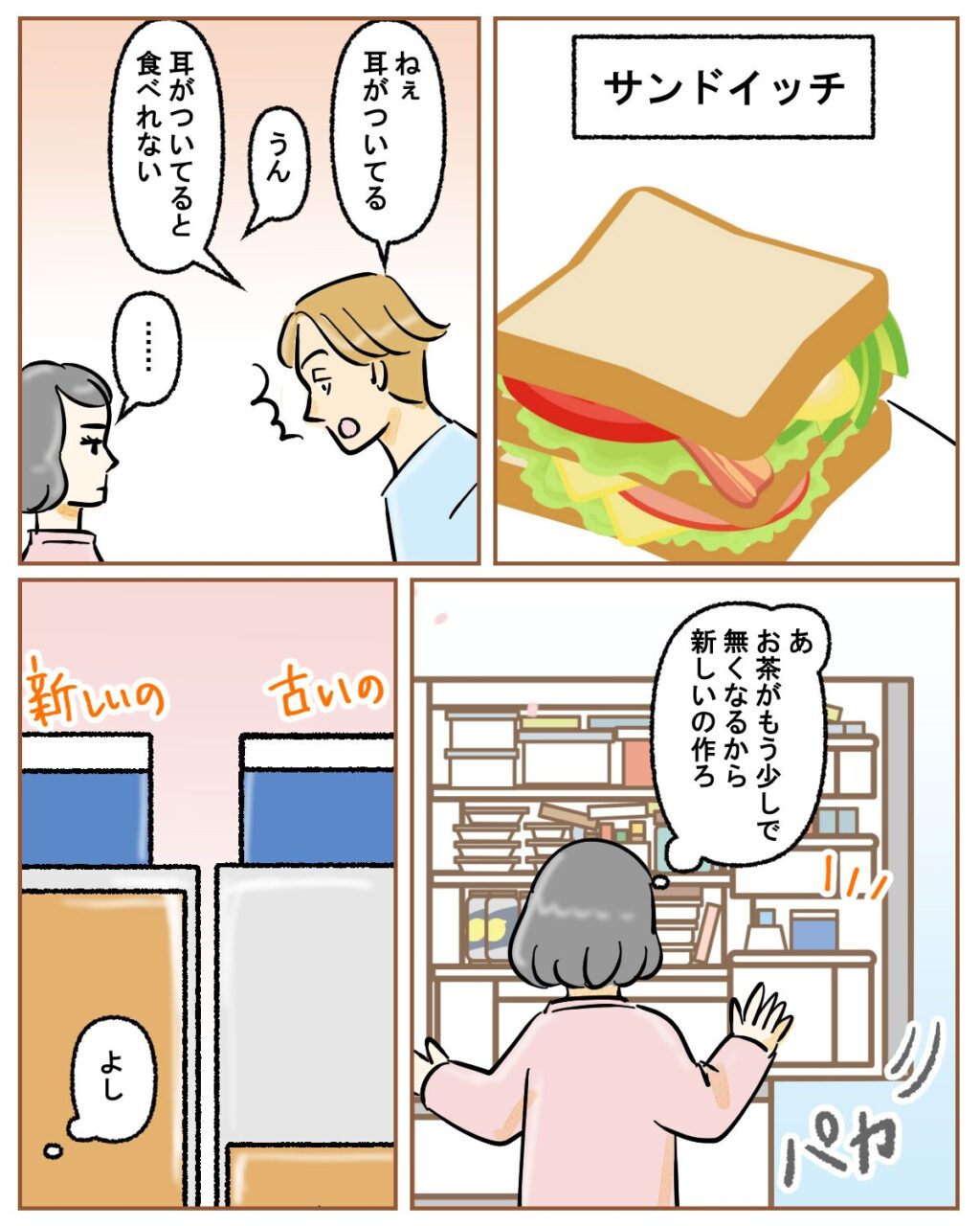 耳があるからとサンドイッチを食べようとしないツカサを、無言でやり過ごした後冷蔵庫を見て、「あ、お茶がもう少しで無くなるから新しいの作ろ」と呟いた後、新しいお茶を作って隣に並べました。