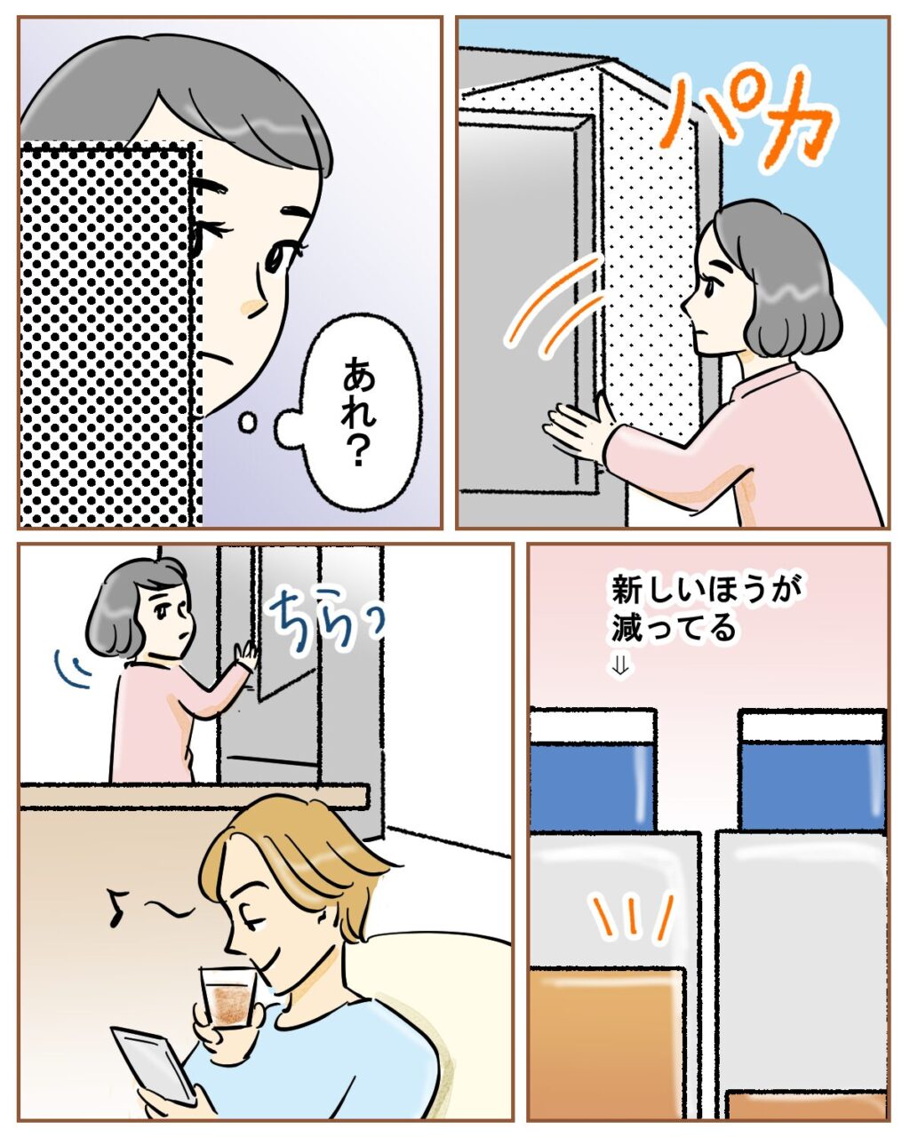 冷蔵庫を開けると、「あれ?」と異変に気づいた私。なんと、古い方でなく新しい方のお茶が減ってる!おかしいと思い、ソファでスマホ片手に寛ぐツカサをチラ見すると、グラスに注いだお茶を飲んでいました。