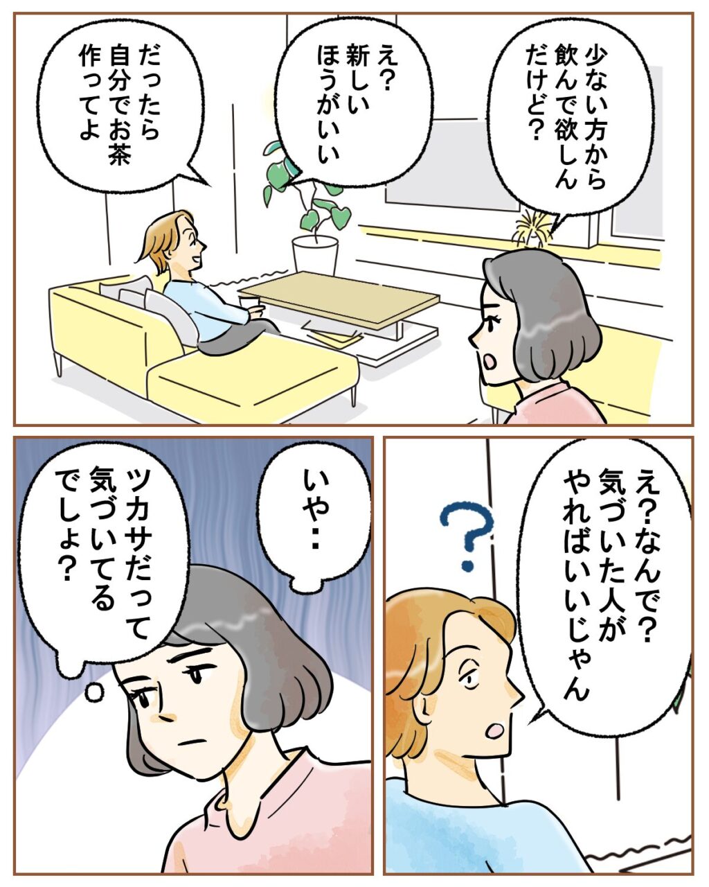 そして、「少ない方から飲んで欲しいんだけど?」ツカサにそう言うと、「え?新しいほうがいい」と即答するツカサ。「だったら、自分でお茶作ってよ」私がそう言うと、「え?なんで?気づいた人がやればいいじゃん」と訳がわからない様子。すっとぼけるツカサを前に、「いや・・ツカサだって気づいてるでしょ?」と全く納得がいきませんでした。