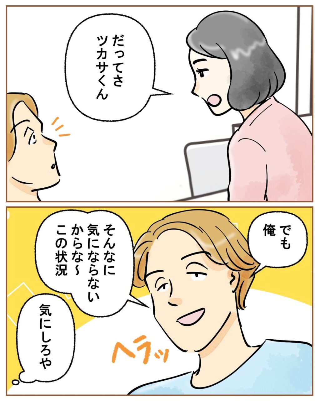 負けずに「だってさ、ツカサくん。」とわざとツカサに言っても、「でも俺、そんなに気にならないからな~この状況」とツカサはヘラヘラ笑うだけです。心の中で(気にしろや)とツッコミを入れてしまいます。