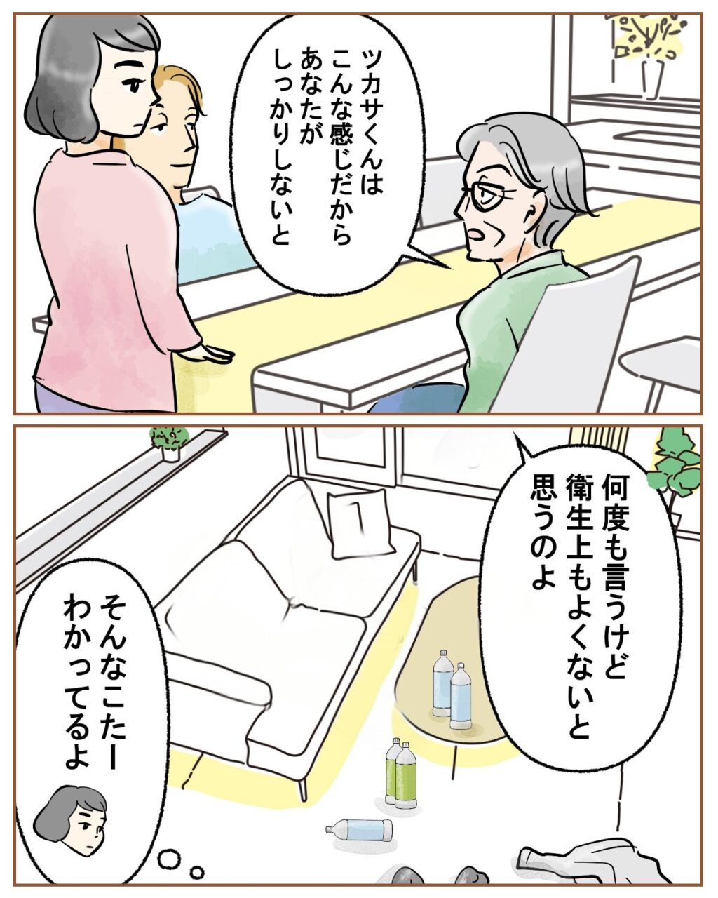 義母は「ツカサくんはこんな感じだから、あなたがしっかりしないと。何度も言うけど衛生上も良くないと思うのよ。」と、義母はあくまでも私に向けて言います。衛生上良くない?そんなこた―分かってるよ。息子はそう思わない育ち方してますけど?言いたい気持ちをぐっと堪えました。