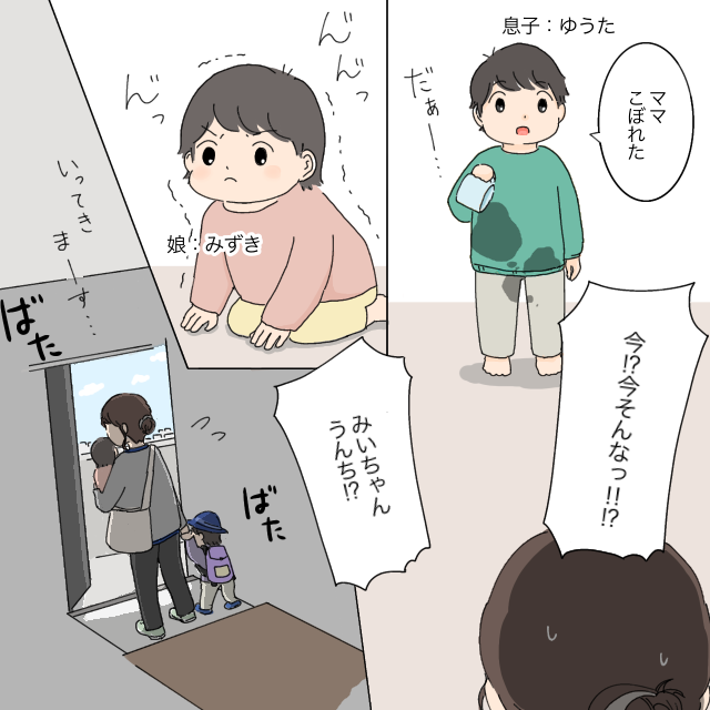 今朝もせっかく着替え終わったところでゆうたが水をこぼして服はびしょびしょに。あぁ、また着替えなくちゃ。そう思っていると今度はみずきが静かになっているので嫌な予感。えぇ、今?今このタイミングで大きい方が出ちゃうのね。毎日こんな感じです。
