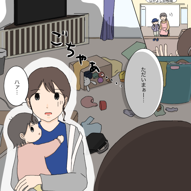 ゆうたを幼稚園に送り、みずきと一緒に帰宅すると、部屋の中は泥棒でも入ったのかと思うレベルの散らかりようを見て思わずため息が出てしまいます。これが平日の朝の様子です。