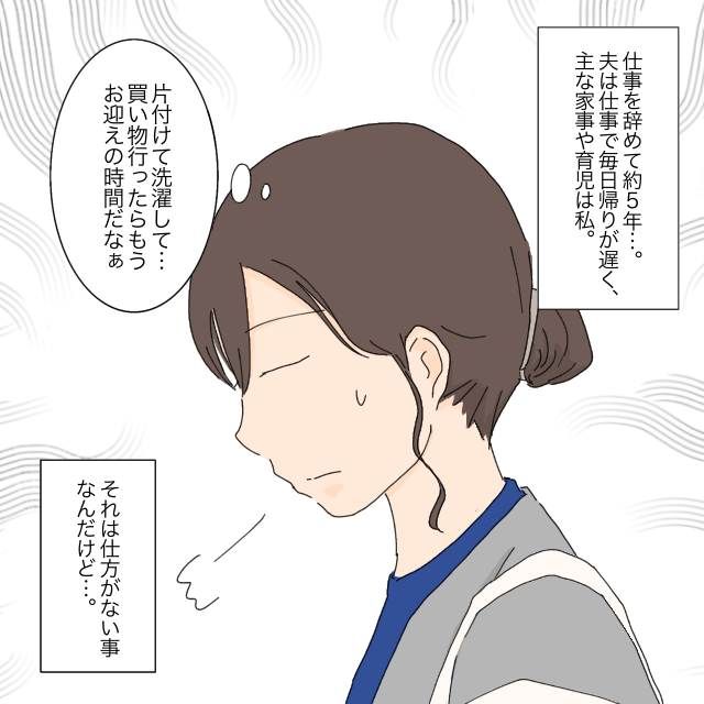 5年前に仕事を辞めて現在は専業主婦の私は、仕事で毎日帰りが遅い夫と一緒に育児はできません。家事と育児はもっぱら私。朝起きてから子どもたちのお世話が始まり、片付け、洗濯、それから買い物に行ったらもう幼稚園のお迎え時間で、あっという間に1日が過ぎていく。毎日その繰り返し。子ども達は可愛いし、専業主婦になったことにも後悔はない。まだ小さい子どもたちに手がかかるのは仕方のないことだとわかってはいます。