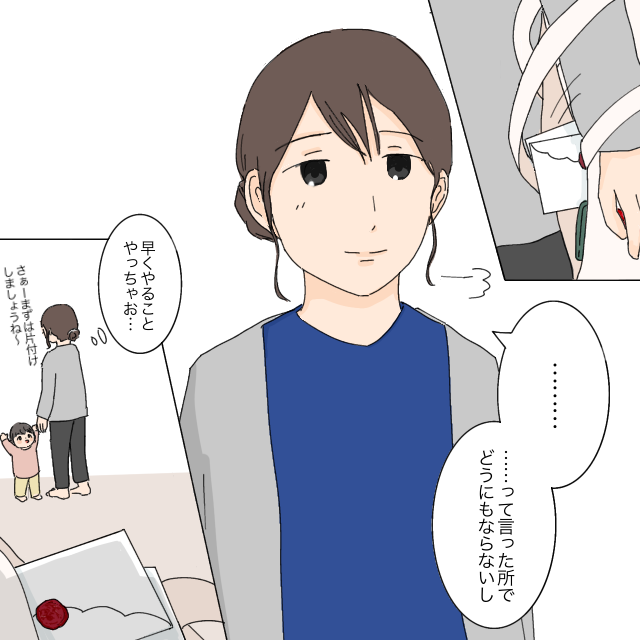 ひとり時間が欲しいって叫んでみたところでどうにもならないし。ふっとため息をついて、気持ちを切り替えます。さて、まずはこの散らかった部屋を片付けなくちゃ。やること早くやっちゃおう。今日もまた変わらない1日が始まりました。