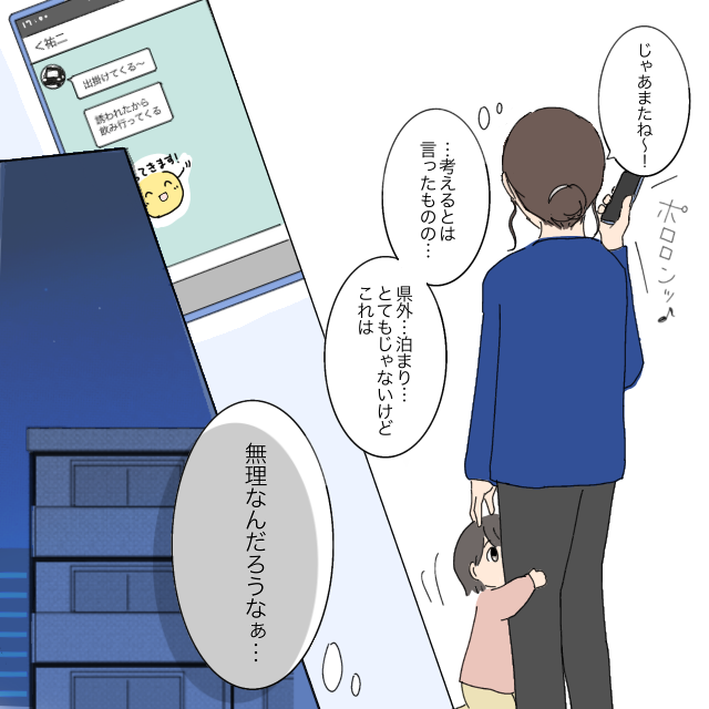 正直、今の状況を考えると外泊なんてとてもできそうにありません。返事に迷った私は「ちょっと・・・どうだろう、考えてみる」と言葉を濁してしまいました。ゆきは私の反応で全てを察したのか「子どもたちまだ小さいもんね、いつでも相談して!」と優しく声をかけます。私はゆきに「ありがとう」とお礼を言い、電話を切りました。