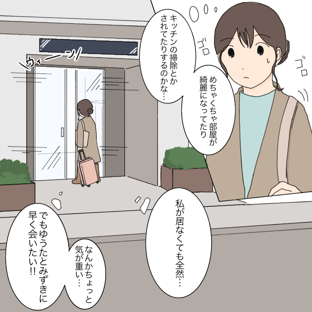部屋が見違えるほど片付いていたり、キッチンまで綺麗に掃除されていたらどうしよう。私がいなくても何の問題もなかったとしたら・・・そう考えるほど、母親としての自信が揺らいで、気持ちが重くなっていきます。それでも早くゆうたとみずきに会いたくて、私は急いでマンションへ入りました。