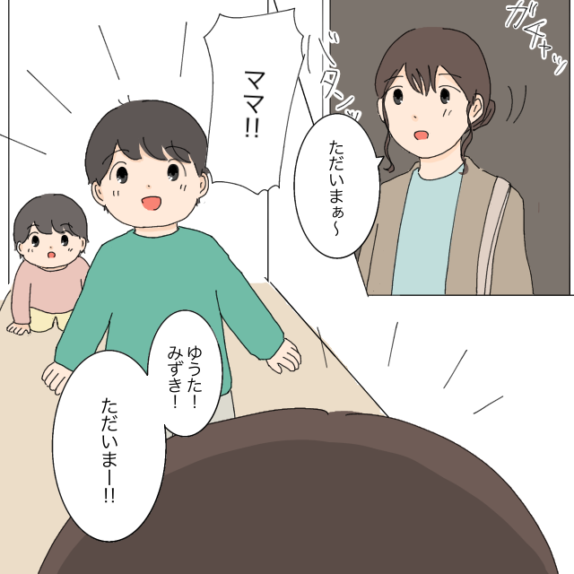 「ただいまぁ~」と玄関を開けると、ゆうたとみずきが駆け寄ってきてくれました。2日ぶりに会う我が子は、やっぱりたまらなくかわいい。私は「ゆうた!みずき!ただいまー!」と笑顔で子どもたちを抱きしめます。