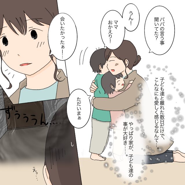 「パパの言う事ちゃんと聞いてた?」と聞くと、ゆうたとみずきは「うん!ママおかえり」と言って、私の胸に飛び込んできました。ほんの数日離れただけなのに、こんなにも愛おしく感じるなんて。やっぱり私は、この家も子どもたちのことも大好きです。ふと顔を上げると、リビングへ続く廊下がどんよりして見えました。何か嫌な予感がする・・・。