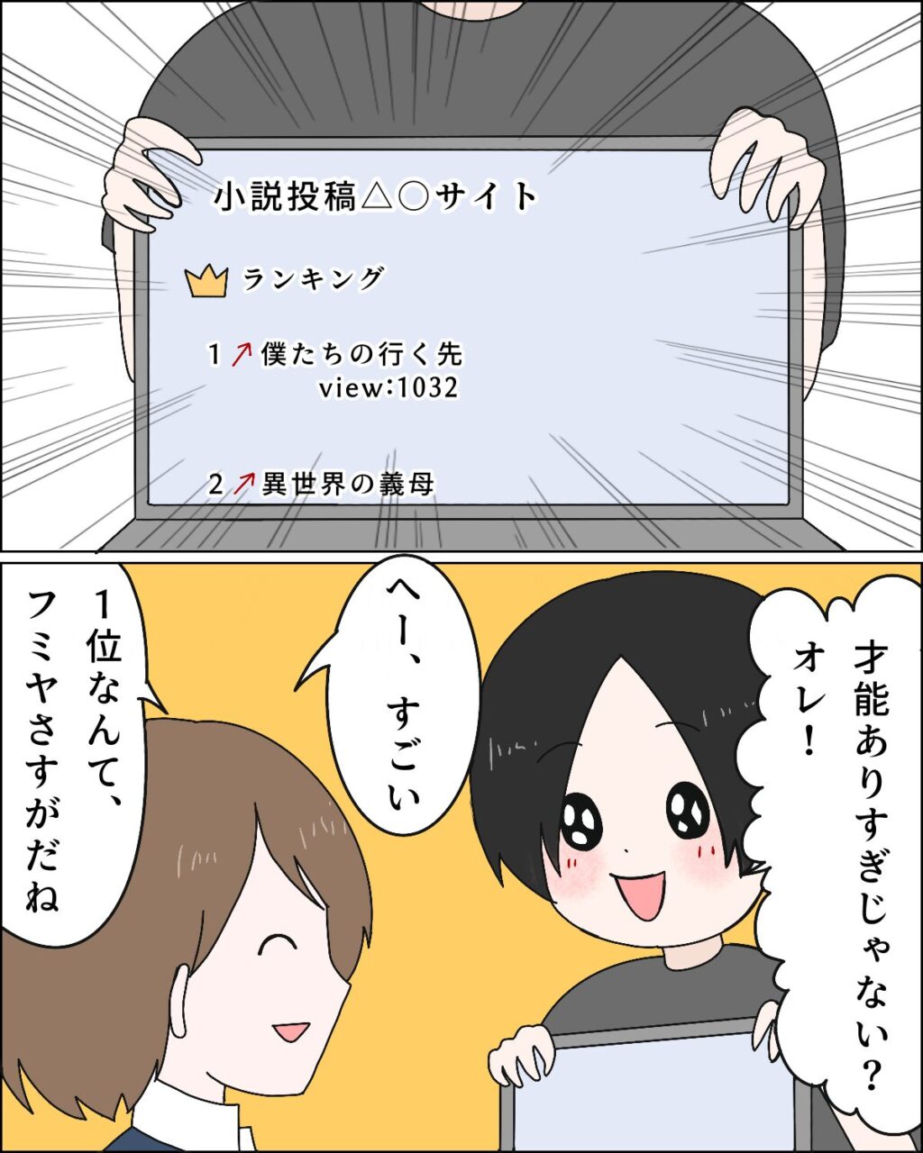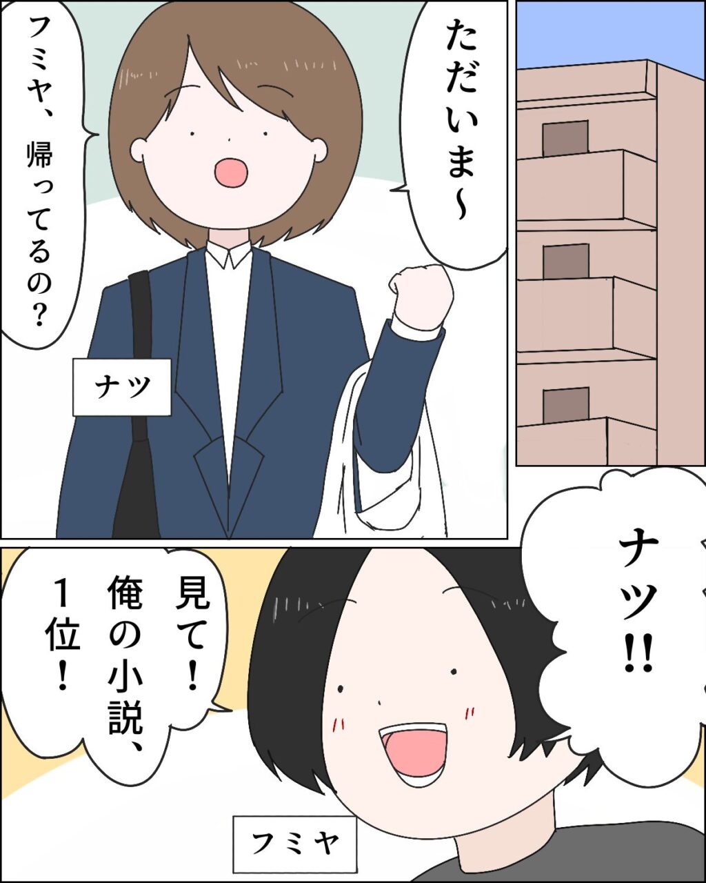 ある日、会社帰りにスーパーで買い物を済ませて帰宅すると、フミヤが嬉しそうに「ナツ!!見て!俺の小説、1位!」と報告してきました。