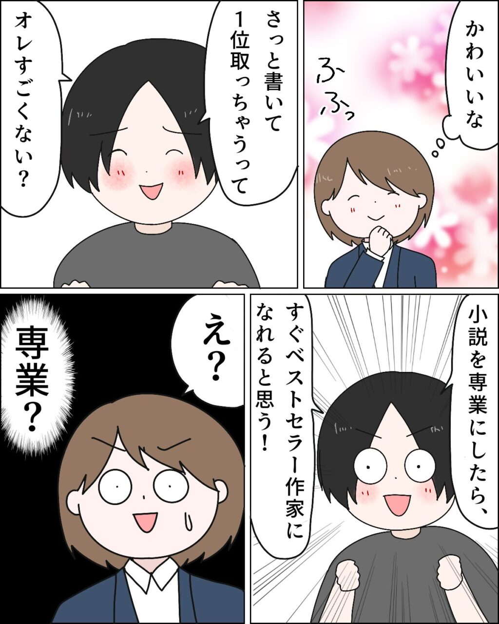 ベストセラー作家になる気満々のフミヤさん、趣味の創作活動なら全く問題ありませんが、まさか投稿サイトで1位を取ったからといってそれだけでナツさんに何の相談もなく会社を辞めてしまうのは、結婚している大人としてあまりにも無責任ですよね。