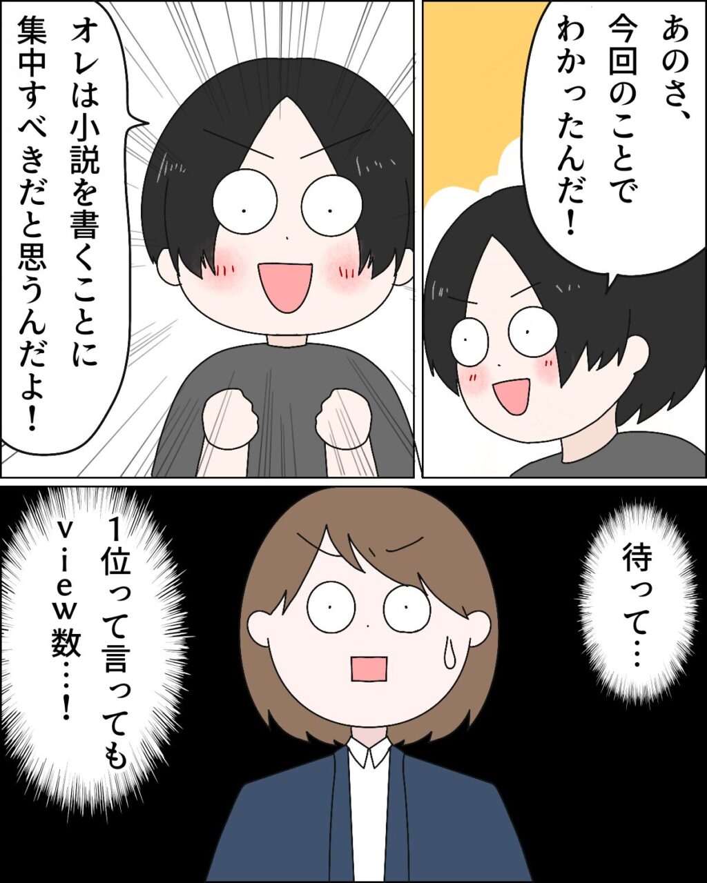 フミヤは「あのさ、今回のことで分かったんだ!オレは小説を書くことに集中すべきだと思うんだよ。」と興奮気味に言っていますが、待って、1位っていってもさ、View数!冷静に考えて?1,032だよ?