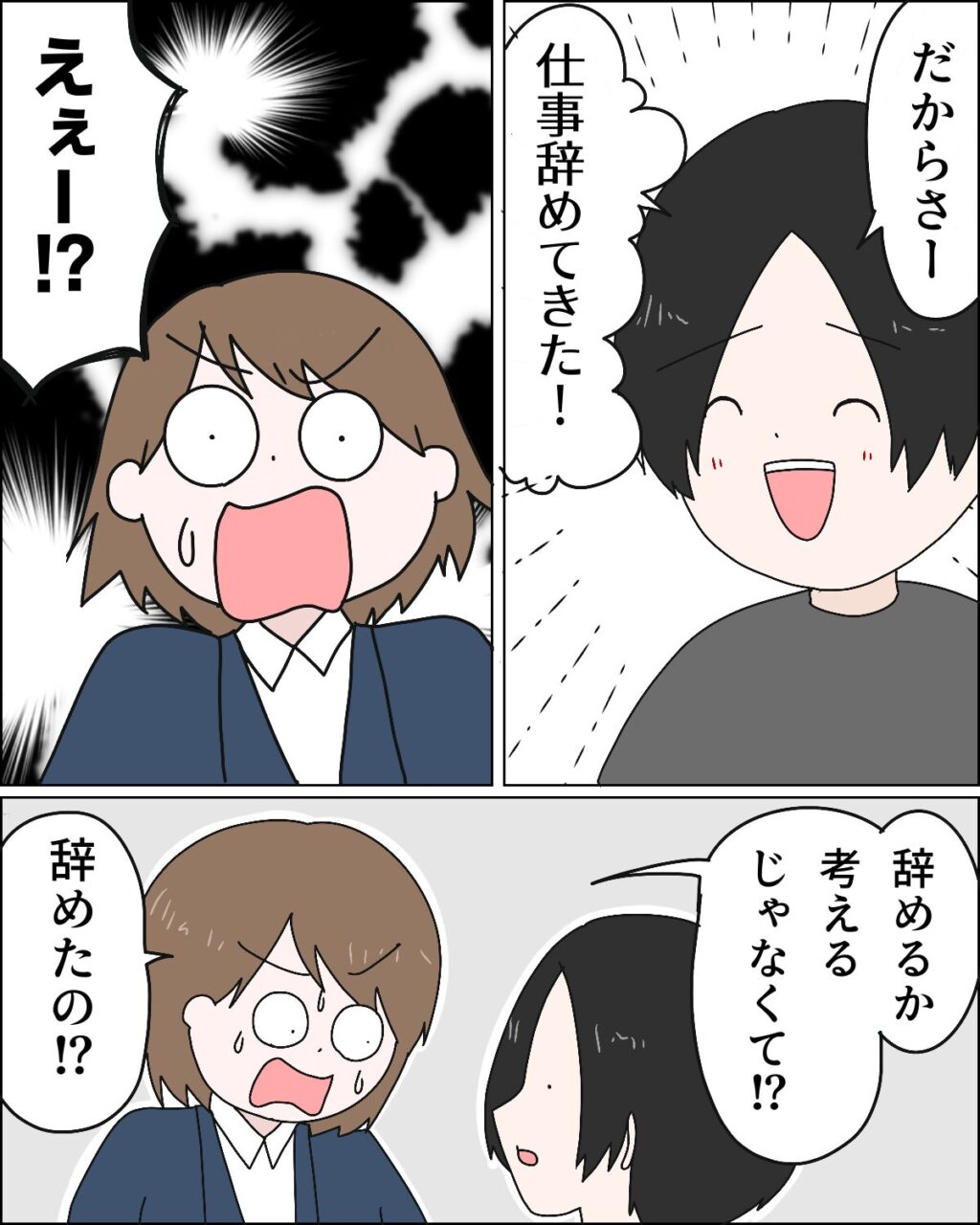 フミヤのあり得ない発言に固まっていると、フミヤはさらに「だからさー、仕事辞めてきた!」とサラリと笑顔で言ったのです。あまりの衝撃発言に「えぇー!?」と叫んでしまいました。何やってんの!?「辞めるか考える、じゃなくて!?辞めたの!?」慌てて聞き返してもきょとんとしているフミヤ。え、ホントに辞めたの!?私に何の相談もなく、突然、夫が無職になりました。