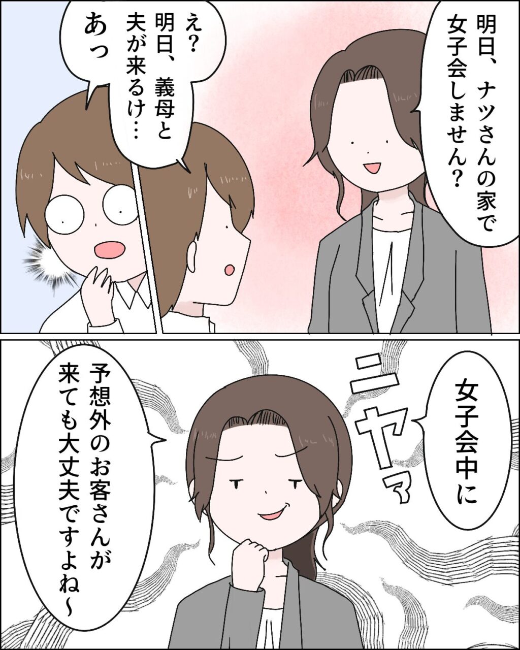 私とフミヤの事情を知っている後輩のカナちゃんは、『明日の夜、母さんと一度そっち行くから準備しとくこと』というフミヤからのメッセージを見ると、唐突に「ナツさん、私、明日暇なんです。明日、ナツさんの家で女子会しません?」と言い出しました。「え?明日、義母と夫が来るけど・・」と言いかけた私は「あっ」とカナちゃんの意図を察しました。カナちゃんは「女子会中に予想外のお客さんが来ても大丈夫ですよね~」とニヤリと笑っていました。