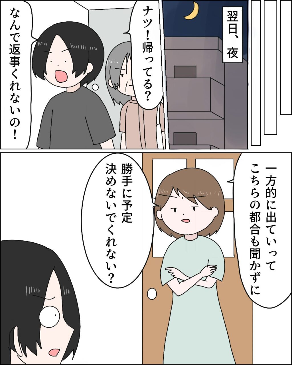 翌日の夜。メッセージに書いてあった通りフミヤが義母を連れて帰ってきました。「ナツ!帰ってる?なんで返事くれないの!」と怒り気味で部屋に入ってきたフミヤに、私は「一方的に出ていって、こちらの都合も聞かずに勝手に予定決めないでくれない?」と反論。