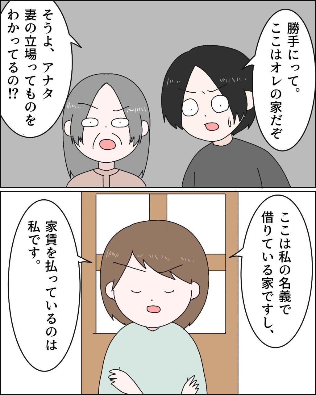 私の反論が予想外だったのか「勝手にって。ここはオレの家だぞ」と少し驚きながら言い返してくるフミヤ。すかさず義母も「そうよ、アナタ。妻の立場ってものをわかってるの!?」とフミヤに加勢します。しかし、私は毅然とした態度で「ここは私の名義で借りている家ですし、家賃を払っているのは私です」と答えました。