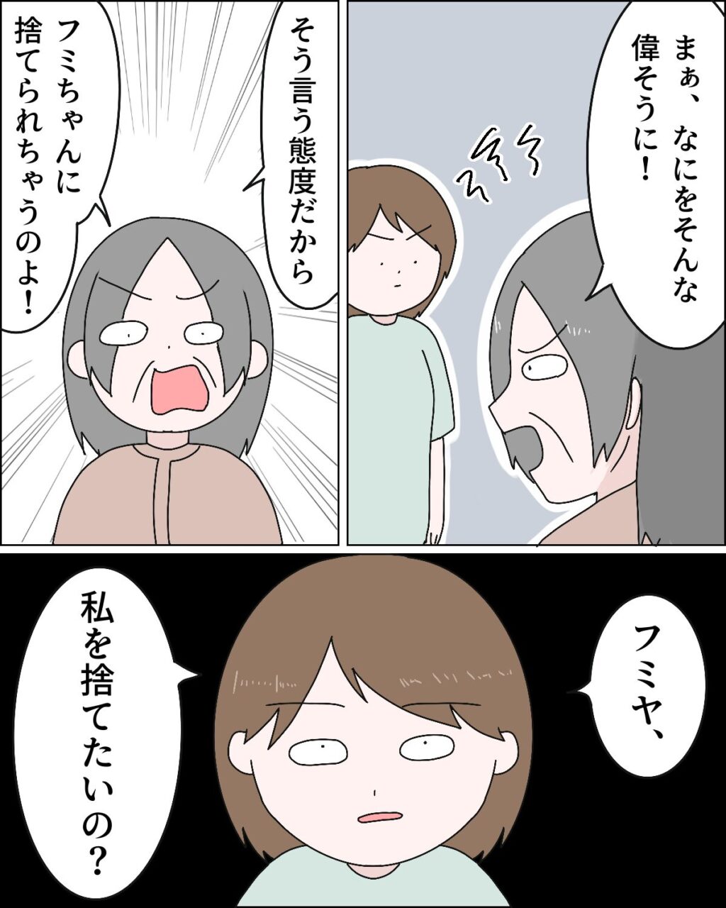 義母は私の態度が気に入らなかったようで「まぁ、なにをそんな偉そうに!」と怒りだし、「そういう態度だからフミちゃんに捨てられちゃうのよ!」と言い放ちました。「フミヤ、私を捨てたいの?」私はフミヤに問いかけました。