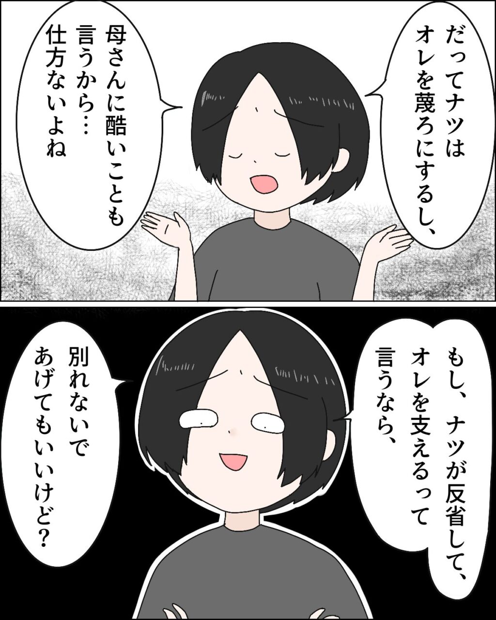 すると、「だってナツはオレを蔑ろにするし、母さんに酷いことも言うから・・仕方ないよね。もし、ナツが反省して、オレを支えるって言うなら、別れないであげてもいいけど?」とここでも上から目線で言ってくるフミヤ。私が離婚を考えているとは夢にも思っていないようです。