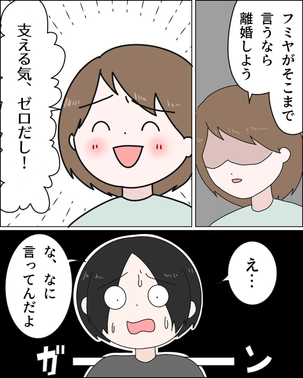 「フミヤがそこまで言うなら離婚しよう。支える気、ゼロだし!」と言うと、「え・・な、なに言ってんだよ」と動揺するフミヤに、