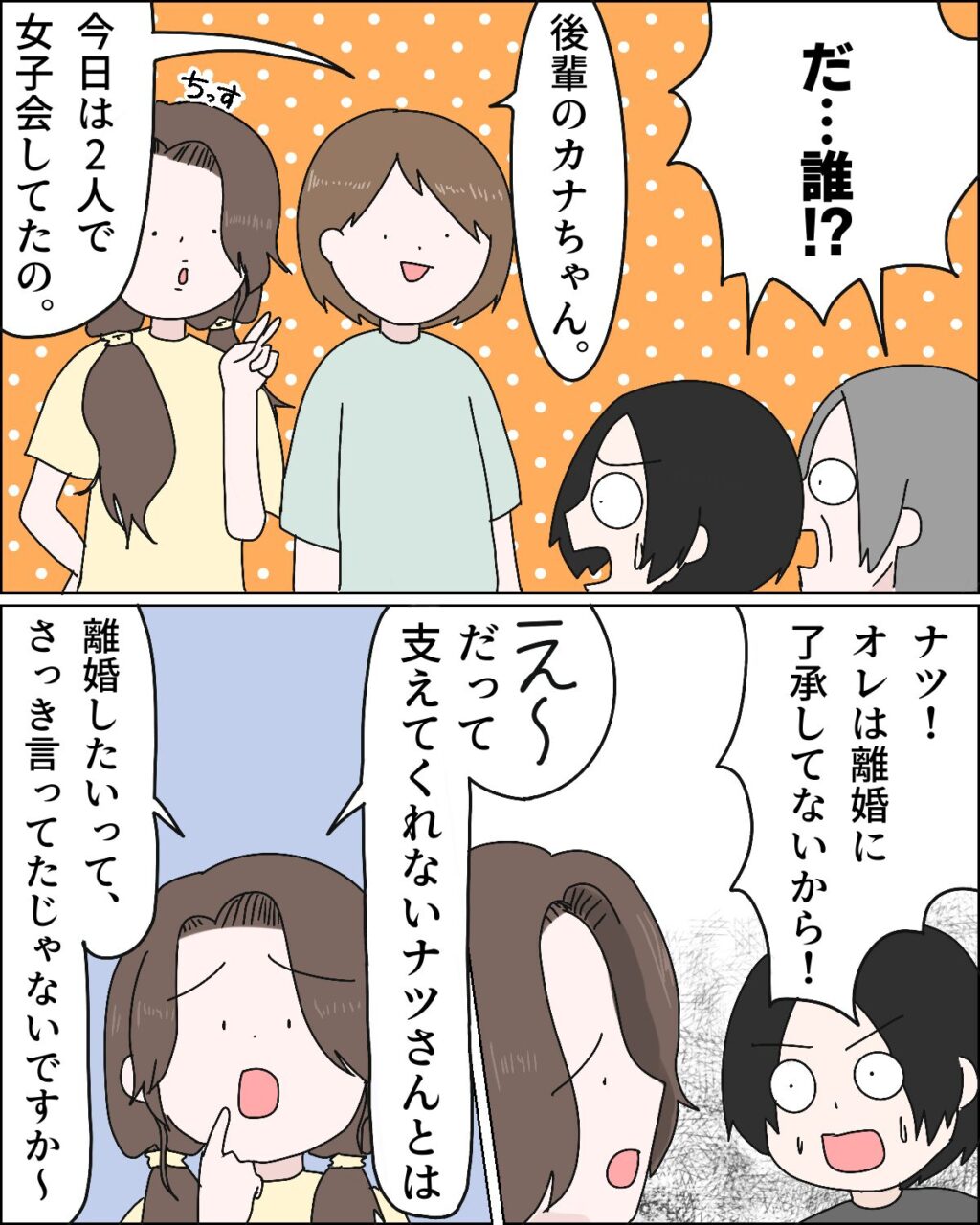 「ナツ!オレは離婚に了承してないから!」フミヤの言葉に、「え~、だって支えてくれないナツさんとは離婚したいって、さっき言ってたじゃないですか~」とカナちゃんが割り込みました。