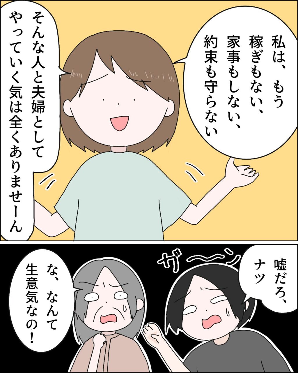 「私、もう稼ぎもない、家事もしない、約束も守らない、そんな人と夫婦としてやっていく気は全くありませーん」と「WHY?」のゼスチャーでそう言うと、「嘘だろ、ナツ」とショックを受けるフミヤの隣で、「な、なんて生意気なの!」と義母が怒り出しました。