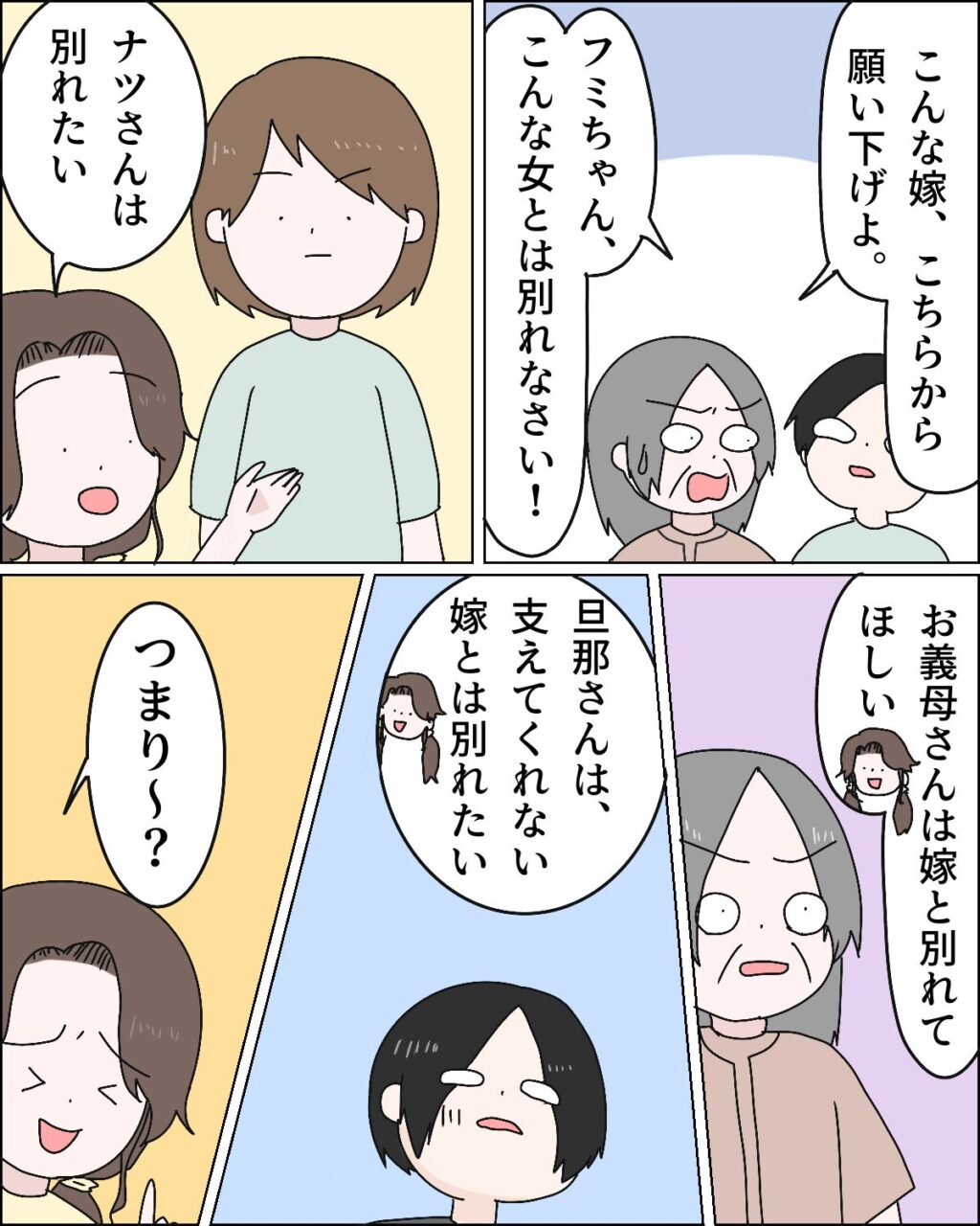 そんなやり取りを見ていた義母が、「こんな嫁、こちらから願い下げよ。フミちゃん、こんな女とは別れなさい!」と言うと、「ナツさんは別れたい」、「お義母さんは嫁と別れてほしい」、「旦那さんは、支えてくれない嫁とは別れたい」と間に入ったカナちゃんが、「つまり~?」