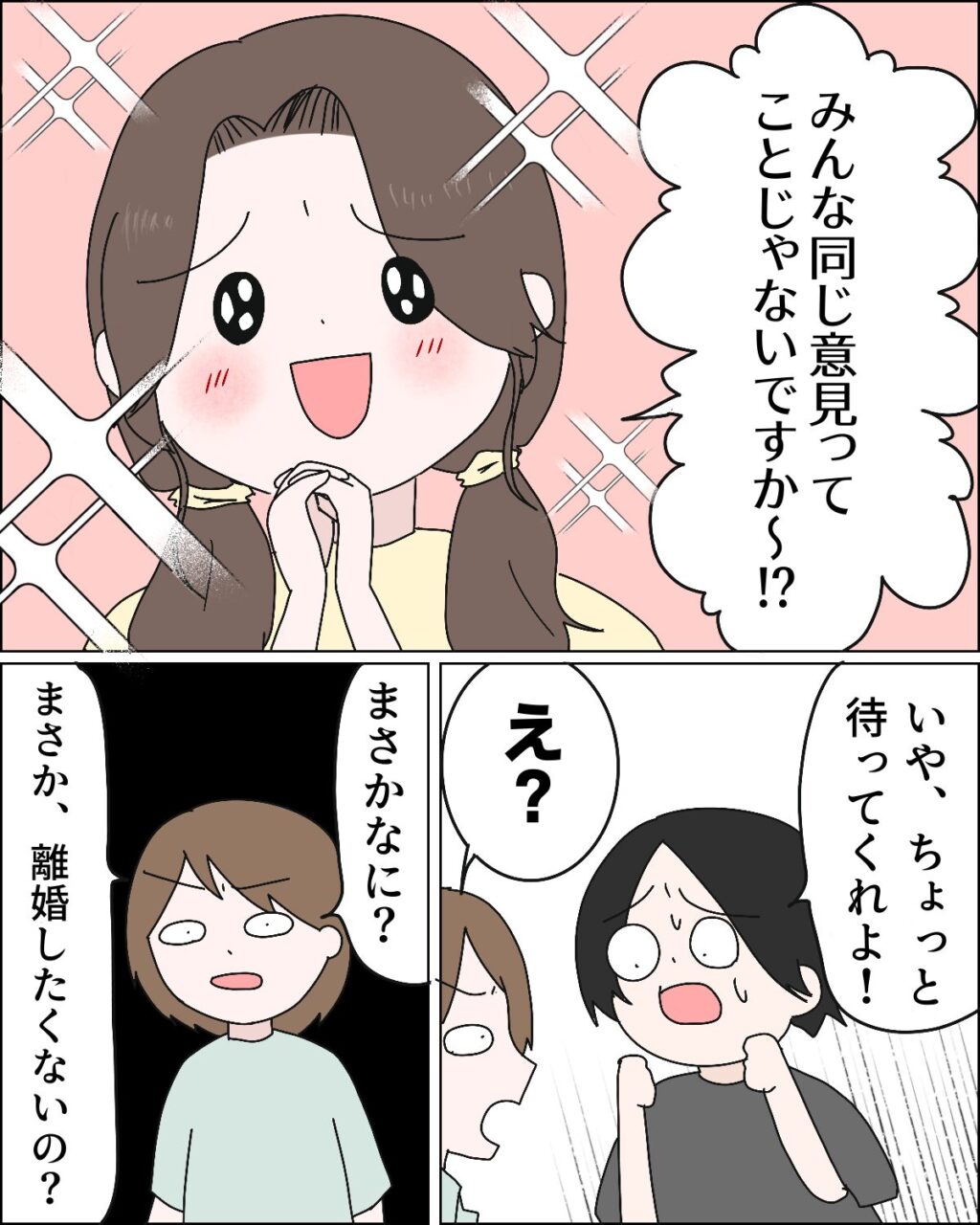 「みんな同じ意見ってことじゃないですか~!?」と目をキラキラさせてそう言うと、「いや、ちょっと待ってくれよ!」と慌てるフミヤに、「え?まさかなに?まさか、離婚したくないの?」と冷たく言うと、