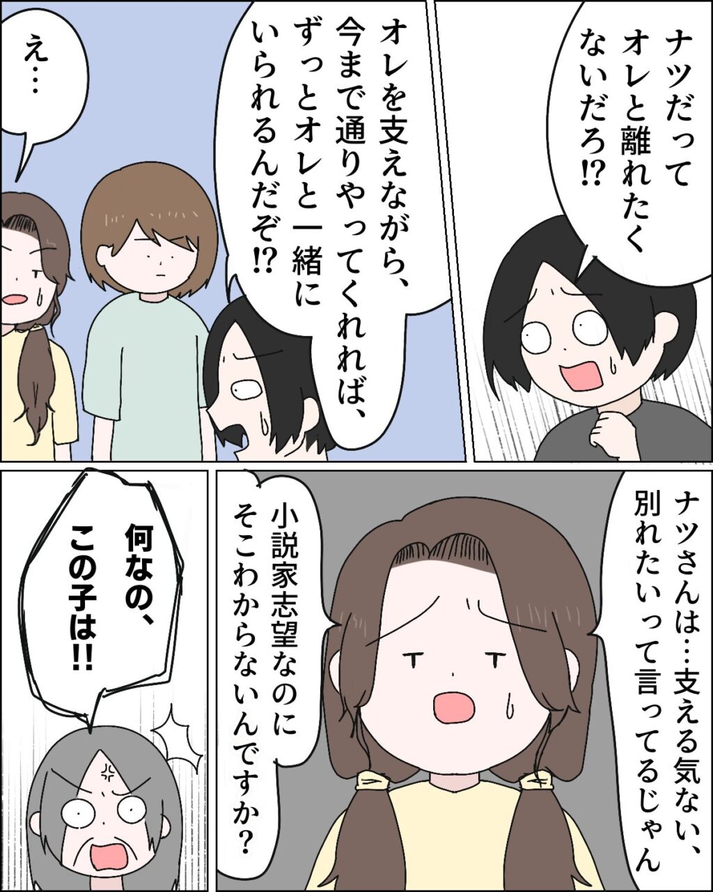 「ナツだってオレと離れたくないだろ!?オレを支えながら、今まで通りやってくれれば、ずっとオレと一緒にいられるんだぞ??」フミヤの言葉に「え・・」と驚くカナちゃんが、「ナツさんは・・支える気ない、別れたいって言ってるじゃん。小説家希望なのに、そこわからないんですか?」と呆れたように言うと、「何なの、この子は!!」と怒り出す義母。