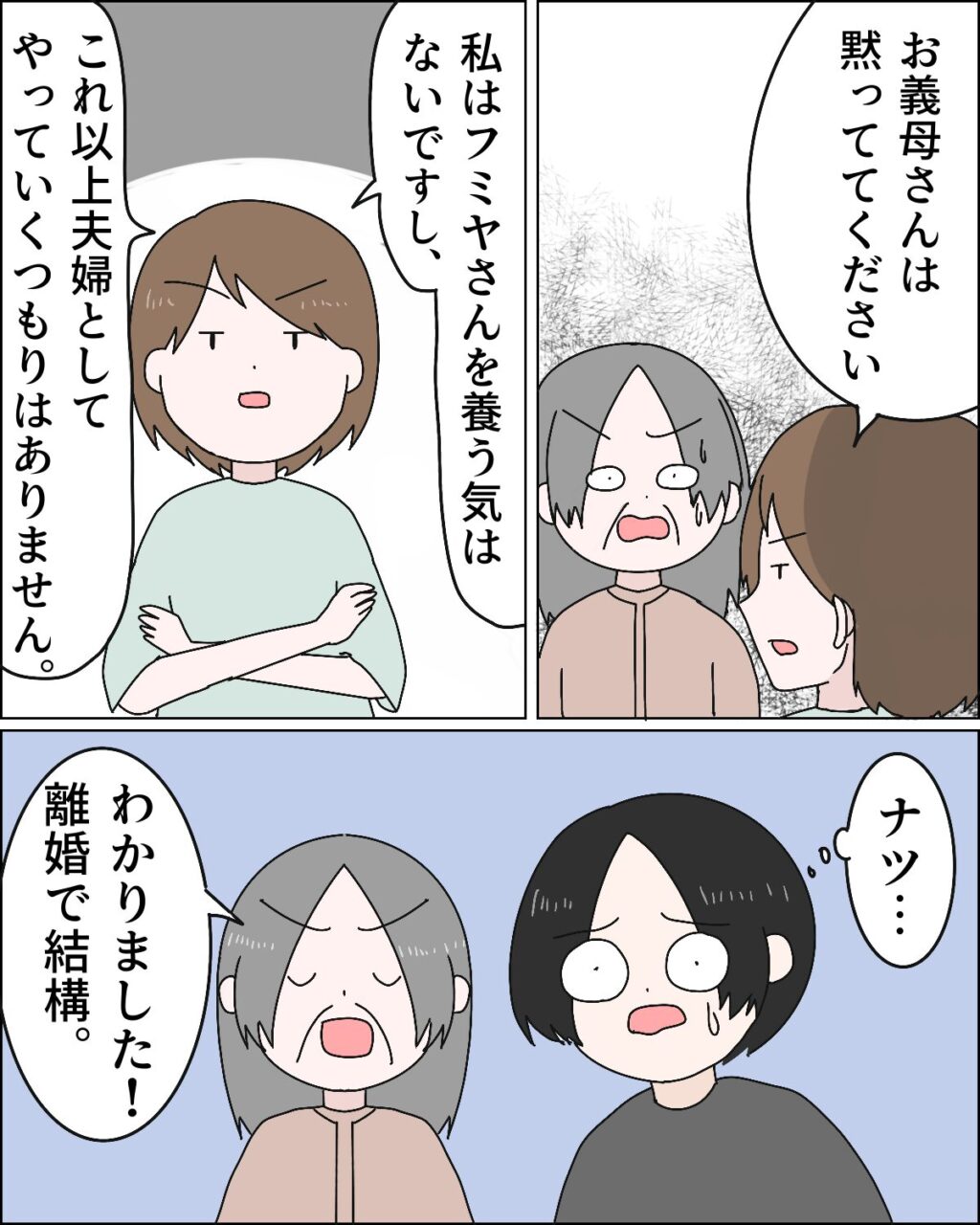 「お義母さんは黙っててください」と言った後、「私はフミヤさんを養う気はないですし、これ以上夫婦としてやっていくつもりはありません」真顔でそう言うと、「ナツ・・」と呟くフミヤの隣で、「わかりました!離婚で結構」と義母が言い、
