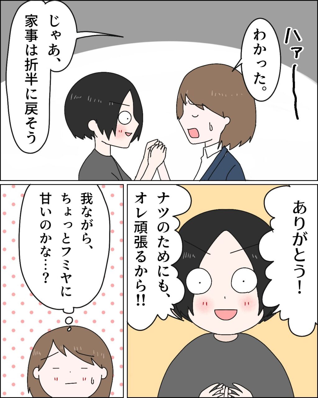 「ハァー、わかった。じゃあ、家事は折半に戻そう」と提案すると、「ありがとう!ナツのためにもオレ頑張るから!!」と満面の笑み。「我ながら、ちょっとフミヤに甘いのかな・・?」と反省しました。
