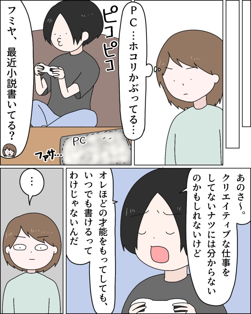 「家事の不出来は責めないでほしい」と言われ、「サボっているだけな気もするけど・・」と思いつつ、協力してほしいと言われたナツさんは、「家事を折半に戻そう」と提案。大喜びのフミヤさんは、その後、家事を全くしないどころか、どうやら小説も書いていないようですね。