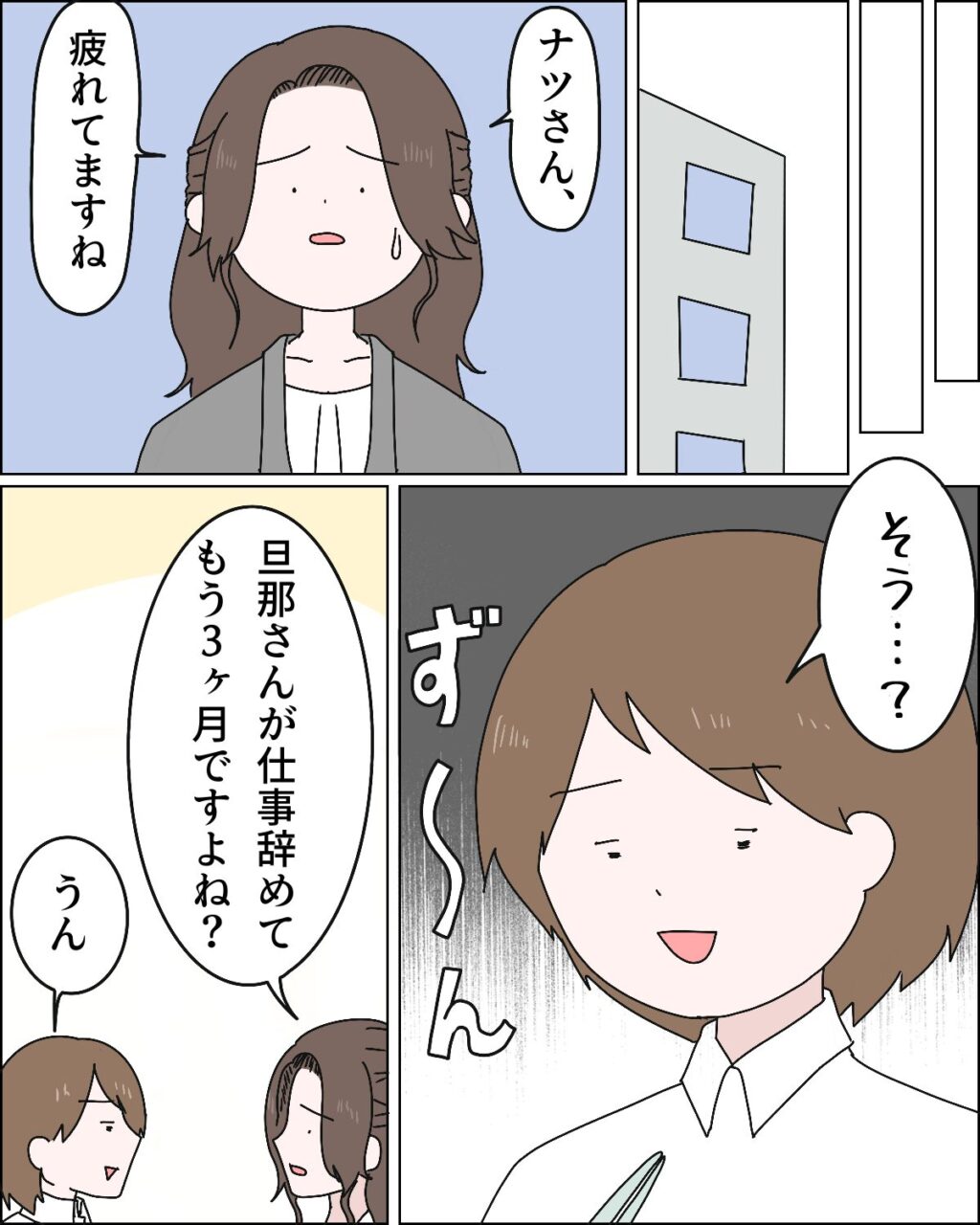 「ナツさん、疲れてますね」会社の後輩カナちゃんにそう言われ、「そう・・?」と答えたものの、気持ちは沈むばかり。「旦那さんが仕事辞めてもう3か月ですよね?」「うん」カナちゃんに聞かれて答えると、