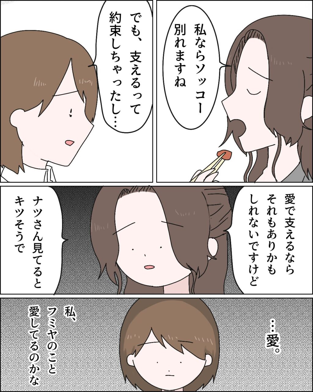 「私ならソッコー別れますね」と言われ、「でも、支えるって約束しちゃったし・・」と答える私に、「愛で支えるなら、それもありかもしれないですけど、ナツさん見てるとキツそうで」とカナちゃんに心配され、「・・愛。私、フミヤのこと愛してるのかな」と自分に問いかけました。